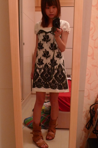 NO509summer折扣款超美蕾絲印花圖騰公主袖洋裝(米白底黑)